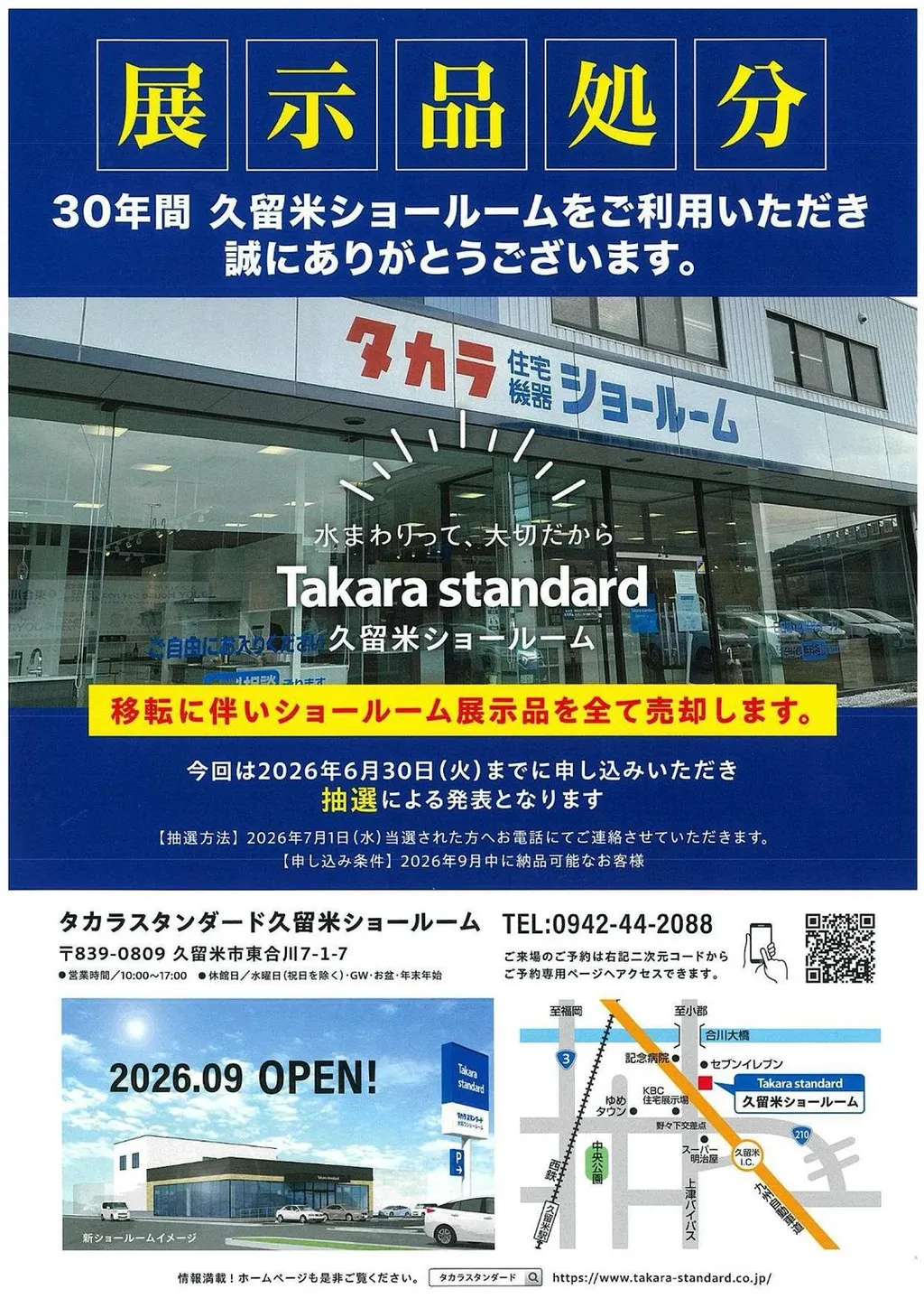 NEWSタカラ久留米ショールーム展示品処分のお知らせ
