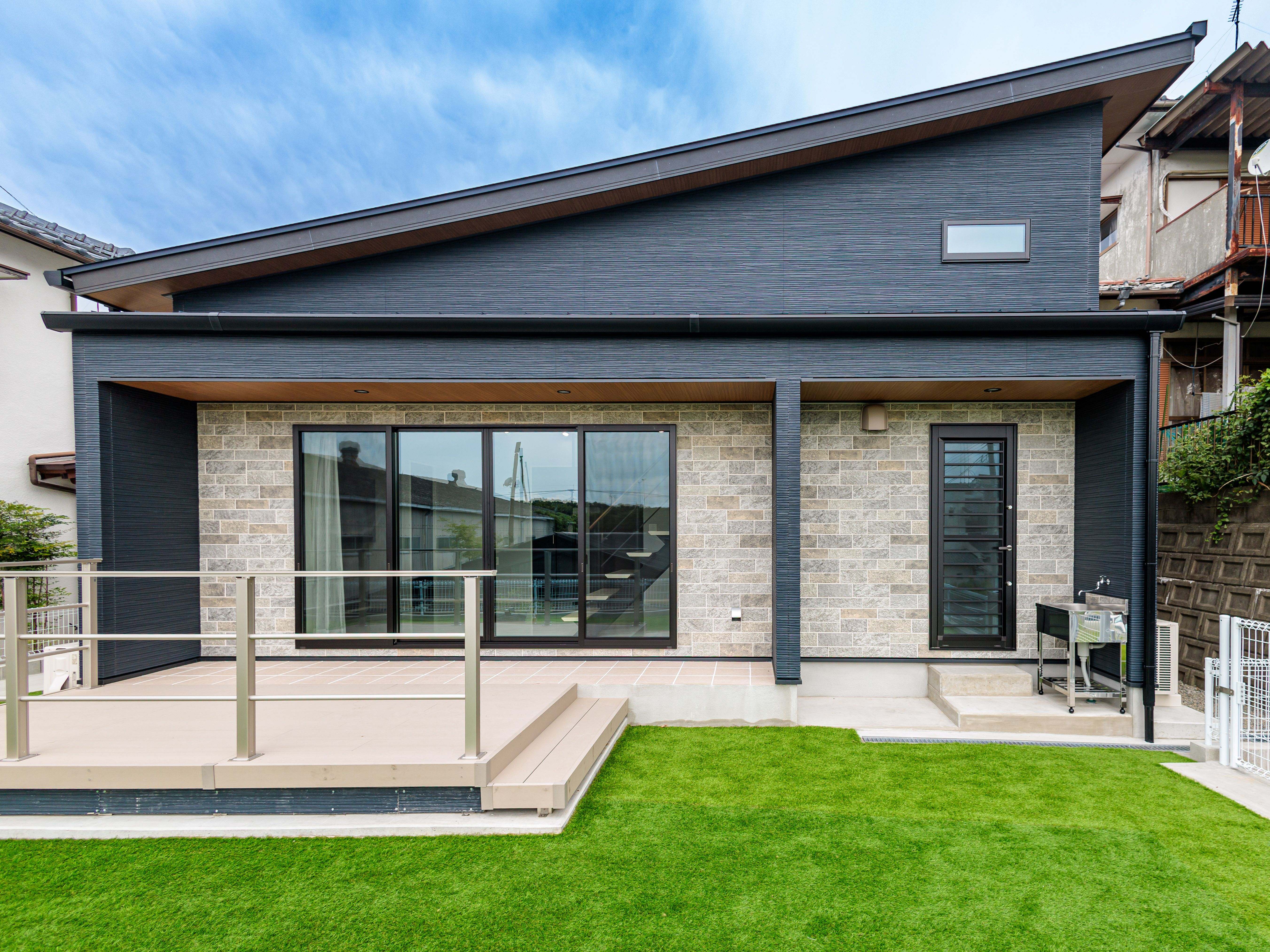 シンプルでありながら個性を感じる外観を目指しました。濃いネイビーの外壁にナチュラルな石目調を合わせて、モダンでありながら温かみを感じさせる佇まいを演出しています。
